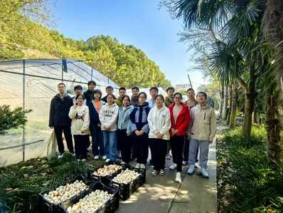 随后,同学们四人一组围坐,每组中间的竹筐里装着饱满的“红色长安”郁金香种球。同学们循着讲解要领,指尖轻捻,小心翼翼地剥去种球外层褐色的老皮,再仔细分辨、剔除纤细的多余侧芽,动作从起初的小心翼翼逐渐变得熟练默契。处理种球的间隙,笑声与交谈声不绝于耳。有的同学分享着剥种时“轻一点就不会伤芽”的小技巧,有的同学聊着刚才在花房瞥见的奇异品种,还有的同学憧憬着“咱们处理的种球,明年春天会不会是花房里最艳的那一片红”。冯梅老师也加入各组,时而示范剥芽手法,时而与同学们闲话家常,花房内的时光,在劳作与欢笑中悄然流淌。