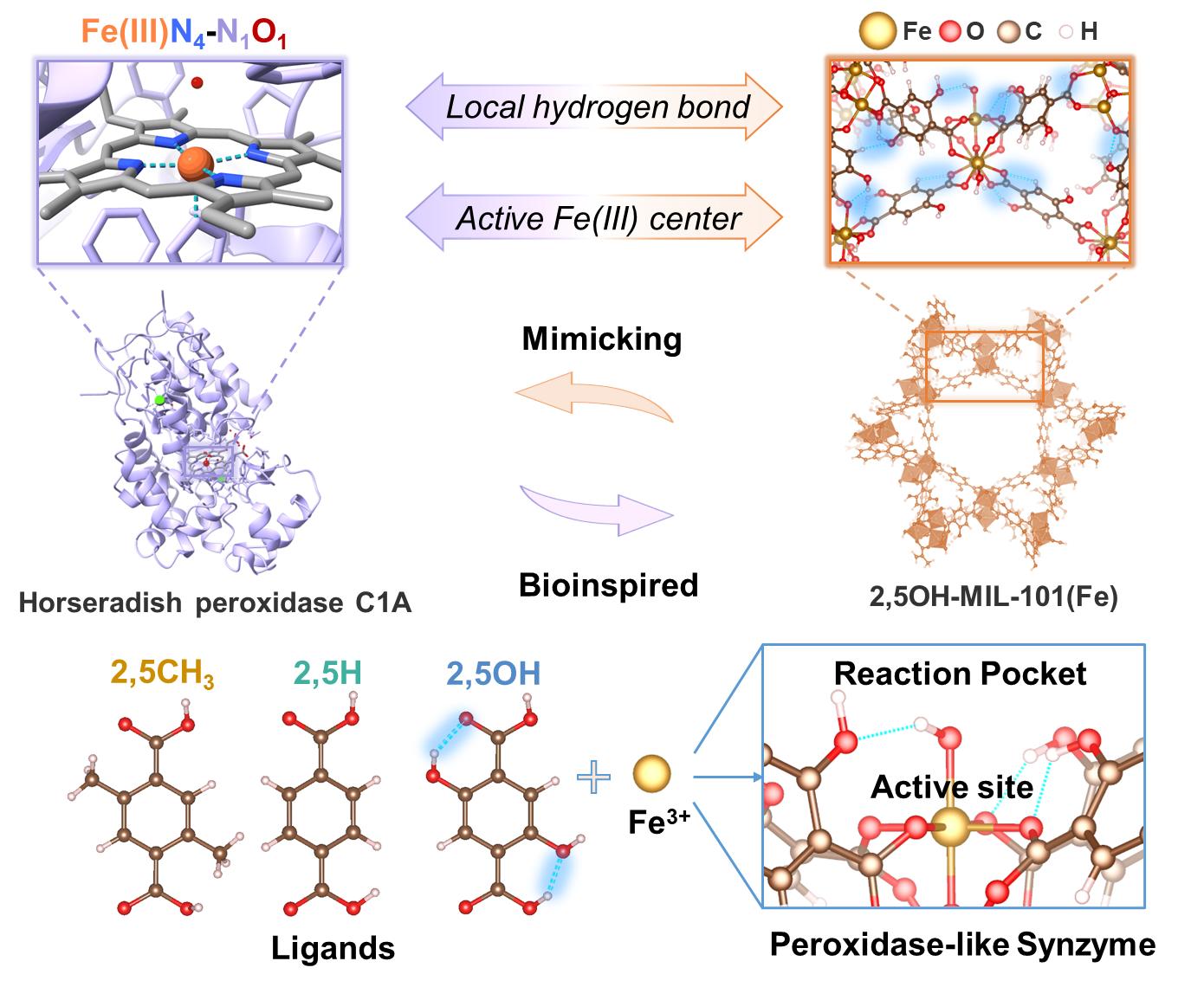 图. 自适应氢键网络协同Fe活性中心的人工过氧化物酶催化剂设计