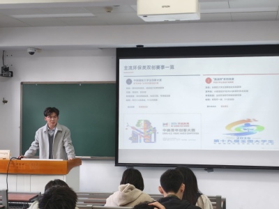 钟玲娟同学围绕“在试错中成长:双创竞赛实战分享”作专题报告。她结合自身参加第十八届全国环境友好科技竞赛并获绿色创业类一等奖、在2025年安徽省“华骐-蓝必盛杯”大学生生态环境创新创业大赛中获特等奖等经历,分享了从项目选择、过程推进到成果展示过程中的实践体会。她鼓励大家以积极心态面对探索中的不确定性,在竞赛过程中学会不断优化方案和提升本领。