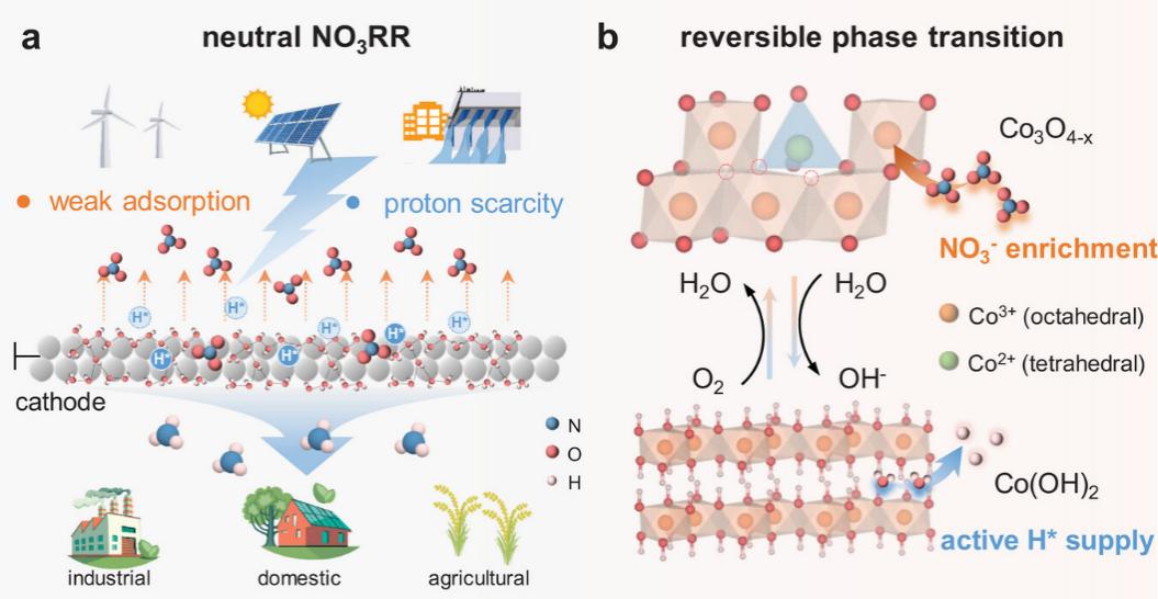 电催化硝酸盐还原合成氨,为同步实现废水处理与资源回收提供了可持续的技术路径。然而,在真实废水常见的中性介质中,该过程面临硝酸盐吸附弱与质子供给匮乏的双重瓶颈。施加高过电位虽可提升反应速率,却往往加剧竞争的析氢反应,导致选择性大幅下降。针对上述挑战,研究团队揭示了缺陷工程化 Co3O4-x催化剂在中性介质中的电压触发可逆相变机制。通过Co3+富集相与Co(OH)2活性相之间的动态重构,在时空上成功解耦了硝酸盐吸附与加氢反应两个关键步骤。实验表明,该催化剂在多种实际废水中无需额外添加电解质,即可实现近100%的法拉第效率和大于90%的氨回收率。这一发现为解决中性介质中硝酸盐还原的动力学难题提供了新思路,也确立了动态相变工程作为设计自适应电催化剂的新策略。