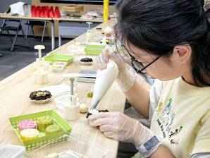 在糕点老师的引导下,大家又兴致盎然地投入到蛋挞的创意制作与装饰中。新鲜的奶油、可食用的花瓣和叶片都成了创作的素材。同学们巧思妙想,用双手点缀出一个个独具匠心的精美蛋挞。