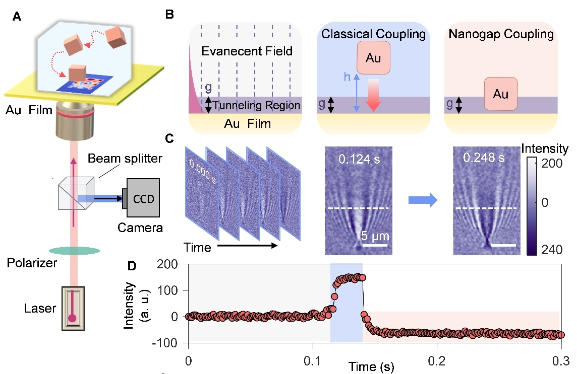 纳米材料界面与电极之间亚纳米级间隙中的动态电子转移过程,对环境、催化、电化学和纳米光子学等领域具有重要意义。然而,如何实时观测电子转移行为,并将其与动态变化的界面间隙关联,仍是该领域长期面临的挑战。针对上述问题,研究基于团队前期研发的等离子体散射干涉显微镜(PSIM),结合纳米电化学调制策略,实现了对纳米颗粒与金电极界面距离变化的实时动态成像。该方法将等离子体耦合效应与具备指数级灵敏度和相位编码能力的单颗粒追踪技术相结合,实现了间隙距离演变与介电环境重构的实时映射。研究进一步借助PSIM的亚纳米级界面追踪能力,系统揭示了可控水化层去除对纳米颗粒-表面相互作用势的显著调控作用,为通过溶剂化结构控制来调控纳米尺度界面过程提供了新思路。电子隧穿过程严格受限于纳米间隙等离子体耦合区域,直接验证了距离依赖型隧穿阈值的理论预测。该研究为在光学频率下探索界面电子转移动力学提供了实验方法,对先进电催化界面、纳米传感平台和光电器件的设计具有指导意义。