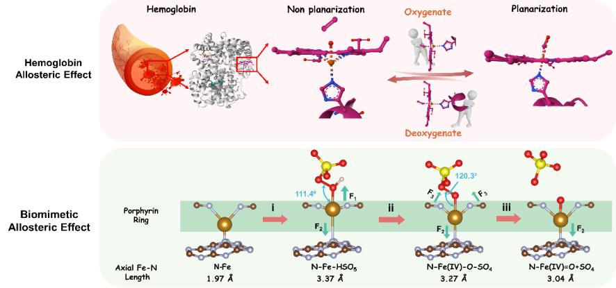 天然酶的高效催化源自其活性位点精准的三维配位环境,该环境构成了一个空间优化的功能性反应中心。受此启发,本研究构建了以天然辅因子血红素与氮化碳纳米片自发轴向配位而成的具有动态三维催化中心的仿生催化剂。这种轴向配位诱导了血红素分子的非平面构型扭曲,进而调控其电子分布。这一结构变化被阐释为一种“仿生变构调控”机制,有效加速了过一硫酸盐活化过程中的限速步骤——硫酸根的解离,从而提升了催化效率。该工作为设计高效稳定的仿生催化剂提供了全新的结构范式与理论依据,为发展绿色水处理技术开辟了新途径。