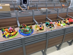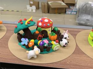 最后是轻粘土创意作品环节,各队需在35分钟内合力用轻粘土复刻或创新包含房屋、植物、动物等元素的作品。拿到材料后,各队即刻开展分工,发挥创意与动手能力,协力完成整体作品的组装。作品展示阶段通过交叉投票决出团队得分,既保证了评选公平公正,也为同学们提供了欣赏与交流创意的平台。