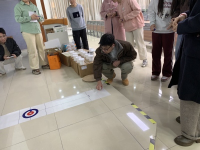 首先进行的是桌面冰壶环节。各队依次上场,通过投掷冰壶争取更高得分。该环节既考验个人的手感与技巧,也强调团队的战术配合。游戏过程中,队员们全神贯注,团队内部实时沟通策略、相互鼓劲,现场气氛紧张而热烈。