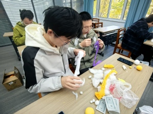 整个过程中,2022级与2025级的同学们互相交流包裹棉球的技巧,分享配色心得,并为彼此初步成型的部件点赞。在共同等待老师协助组装的间隙,同学们的自发交流也悄然展开。手工的沉浸感有效缓解了学业压力,而跨年级的协作与分享,则快速消融了陌生感,建立起轻松愉快的朋辈联结。