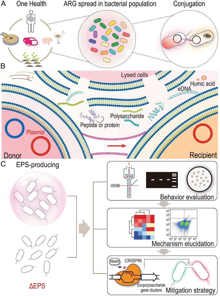 近期,中国科学技术大学环境科学与工程系在细菌胞外聚合物介导的抗生素抗性基因接合传播机制及调控策略研究方面取得新进展。研究团队系统解析了胞外聚合物在细菌间抗性质粒转移过程中的动态作用及其分子调控机制,并开发了以胞外聚合物合成为靶点的抗性质粒传播阻断方法。相关研究成果以“Unveiling the Impact of Extracellular Polymeric Substances (EPS) on the Conjugative Transfer of Antibiotic Resistance Genes (ARGs)”为题,发表于Environmental Science & Technology。