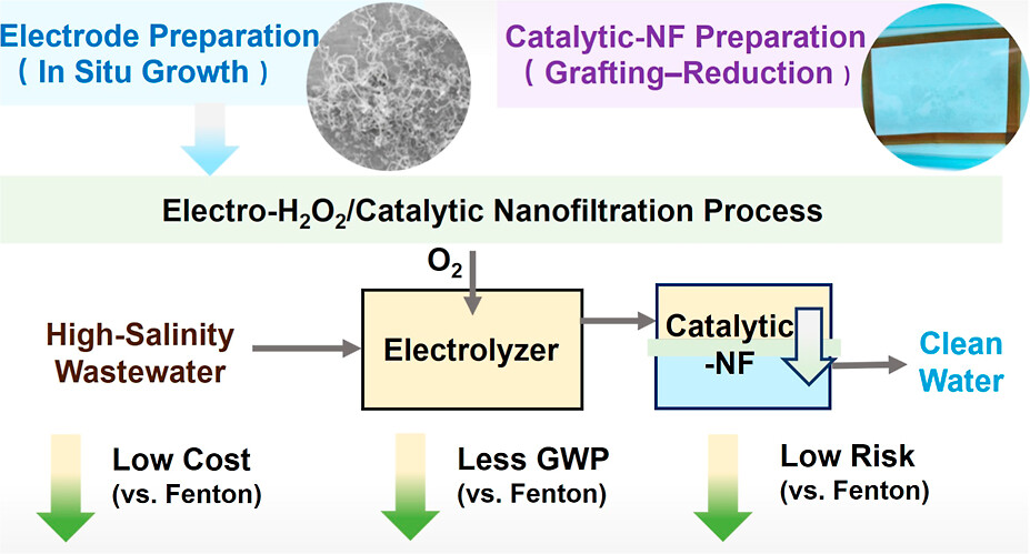 针对高盐废水有机物去除困难和电催化产H2O2在实际应用中面临的分离和利用的瓶颈,本研究提出了一种一体化解决策略:将高盐废水原位电合成H2O2与催化纳滤膜活化H2O2降解截留的有机物相结合,开发了一种电催化-催化纳滤一体化技术。该平台无需外加化学品,在制药废水中实现了90%的COD去除和98%的硫酸根截留,同时碳排放降低34%、运行成本降低36%,是一种低碳、高效、可持续的高盐废水处理新策略。