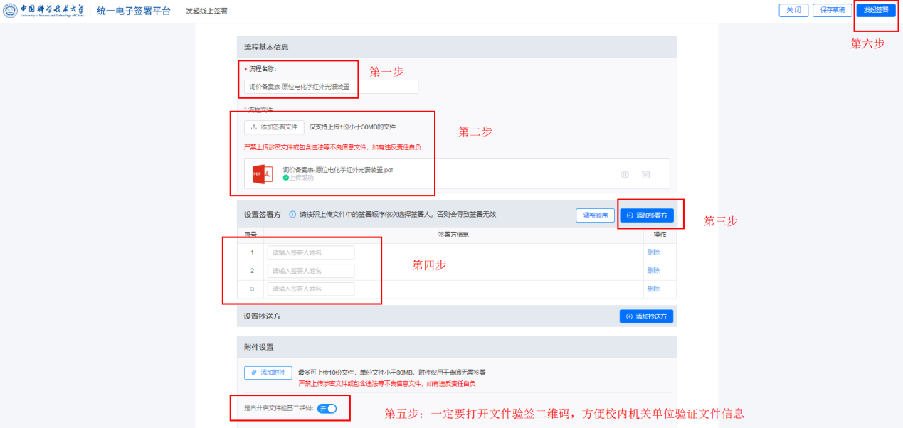 3、按要求填写流程名称、上传需要签字的“询价采购备案表”,设置签署方3人(询价小组成员,建议特任副及以上教职工),发起签署。(注意,上传的询价采购备案表需是最终版,内容已确定并填写除签名以外的所有信息)