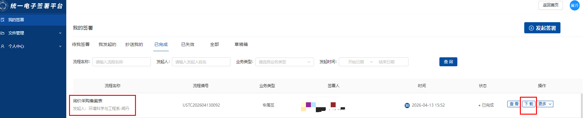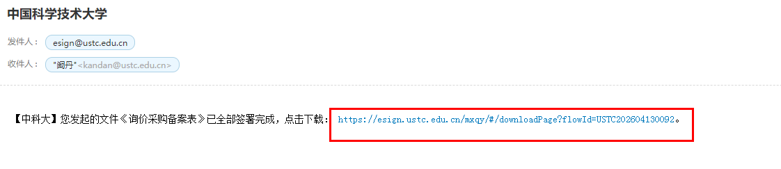 4、签署方全部签字完成后会收到系统邮件,再次进入统一电子签署平台,下载签署完成后的“询价采购备案表”(含3人电子签章、电子验签二维码)。