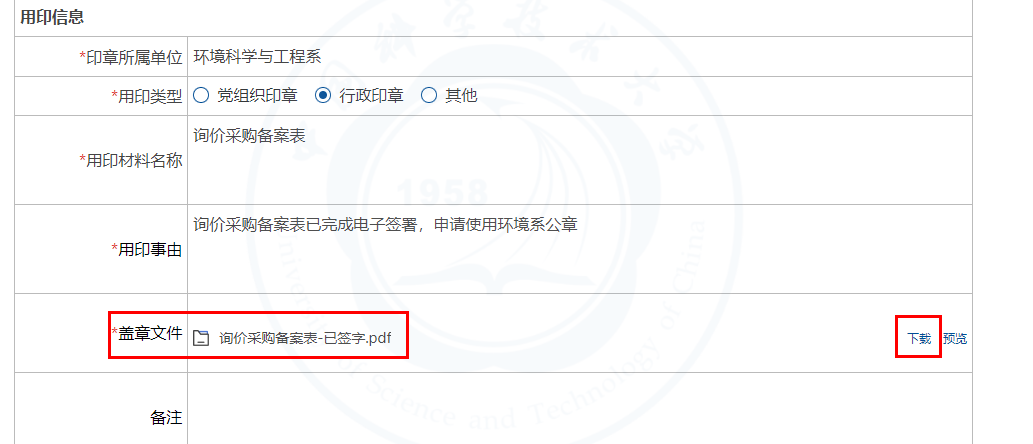 申请人发起“环境系用印申请”,线上完成环境系盖章,下载盖章后文件。