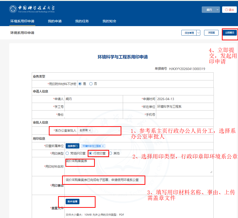 中国科学技术大学环境系用印申请流程(https://service.ustc.edu.cn/fe/taskCenter/one/application?app_id=331):