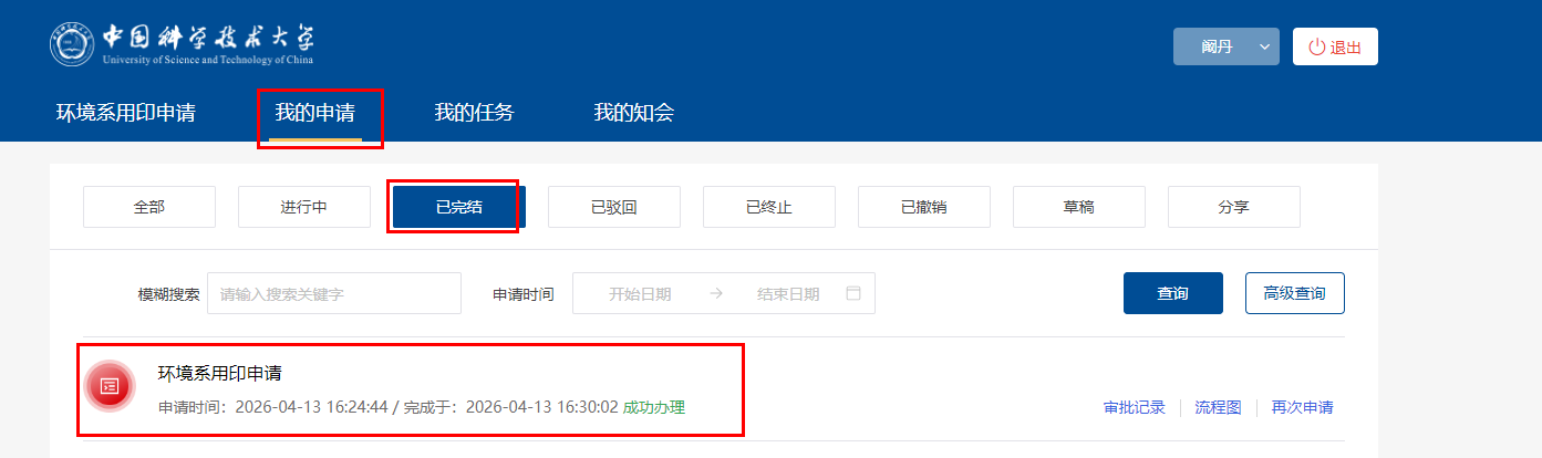 6、用印流程结束后,会有站内信和短信提醒,再次进入“环境系用印申请”流程,查看“我的申请”-“已完结”-找到用印申请流程-打开流程-下载盖章后文件。